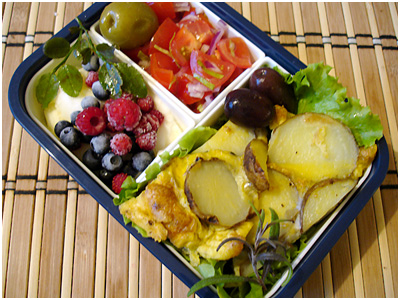 Main course: Spanish potato tortilla on a bed of salad. Black garlic olives.
