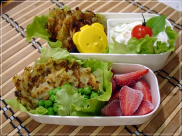 I try to follow the rule of colours in every bento I make: Red (tomato and strawberries), yellow (the bear and also the latkes), green (peas and salad), light (tsatsiki) and dark (the latkes again). This is not something that I do because I feel bentos should be done according to strict rules - I was doing this long before I ever read that such a rule existed! I like contrasts and use them - you will find that even in bentos that strive to be monochrome, the creator uses contrasts artfully to make the bento visually appealing.